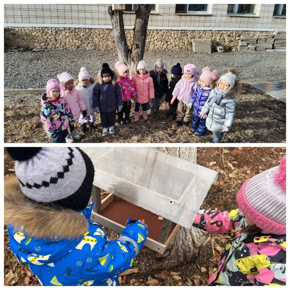 «Солнышко» тобының балалары қауырсынды достарына қамқорлық жасап, оларға тәттілер салынған фидер іліп қойды. Тәрбиешілер: Прокофьева Н.В, Ильина В.И.